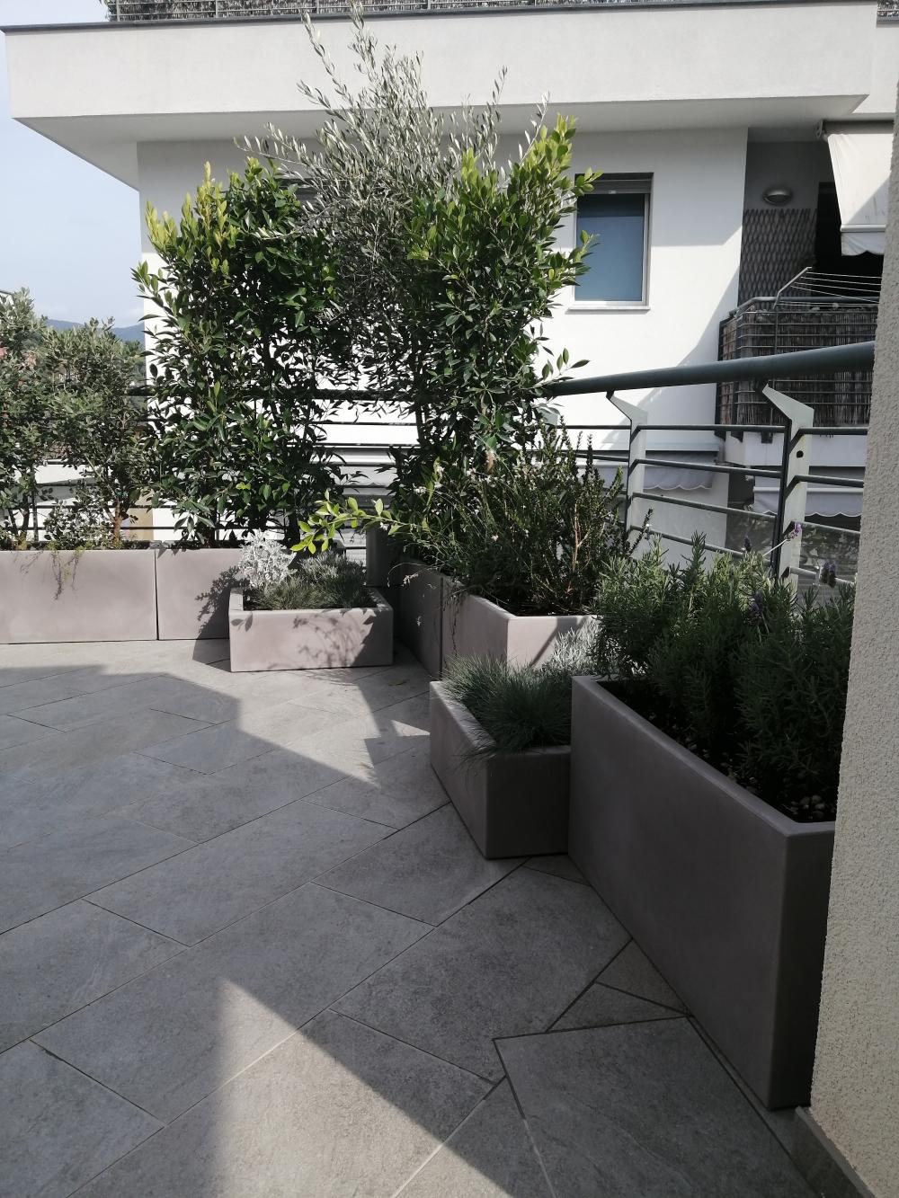 Il cliente aveva l′esigenza di sfruttare al meglio il suo terrazzo e schermarsi in alcuni punti. Abbiamo progettato e realizzato un terrazzo con vasi moderni di colore griglio chiaro, di dimensioni e altezze diverse, che si inseriscono molto bene in tutto il contesto, creando anche movimento con piante mediterranee a bassa manutenzione. Il terrazzo verrà ultimato con l′inserimento di un pannello decorativo per la schermatura laterale.