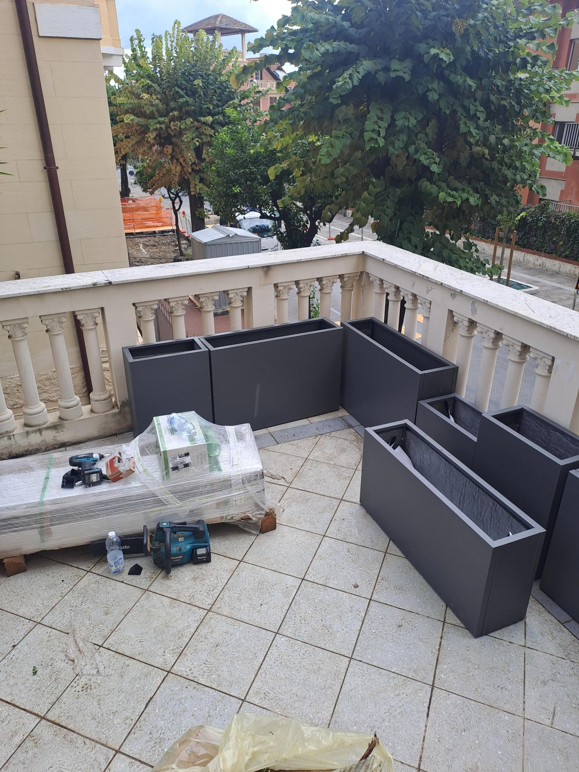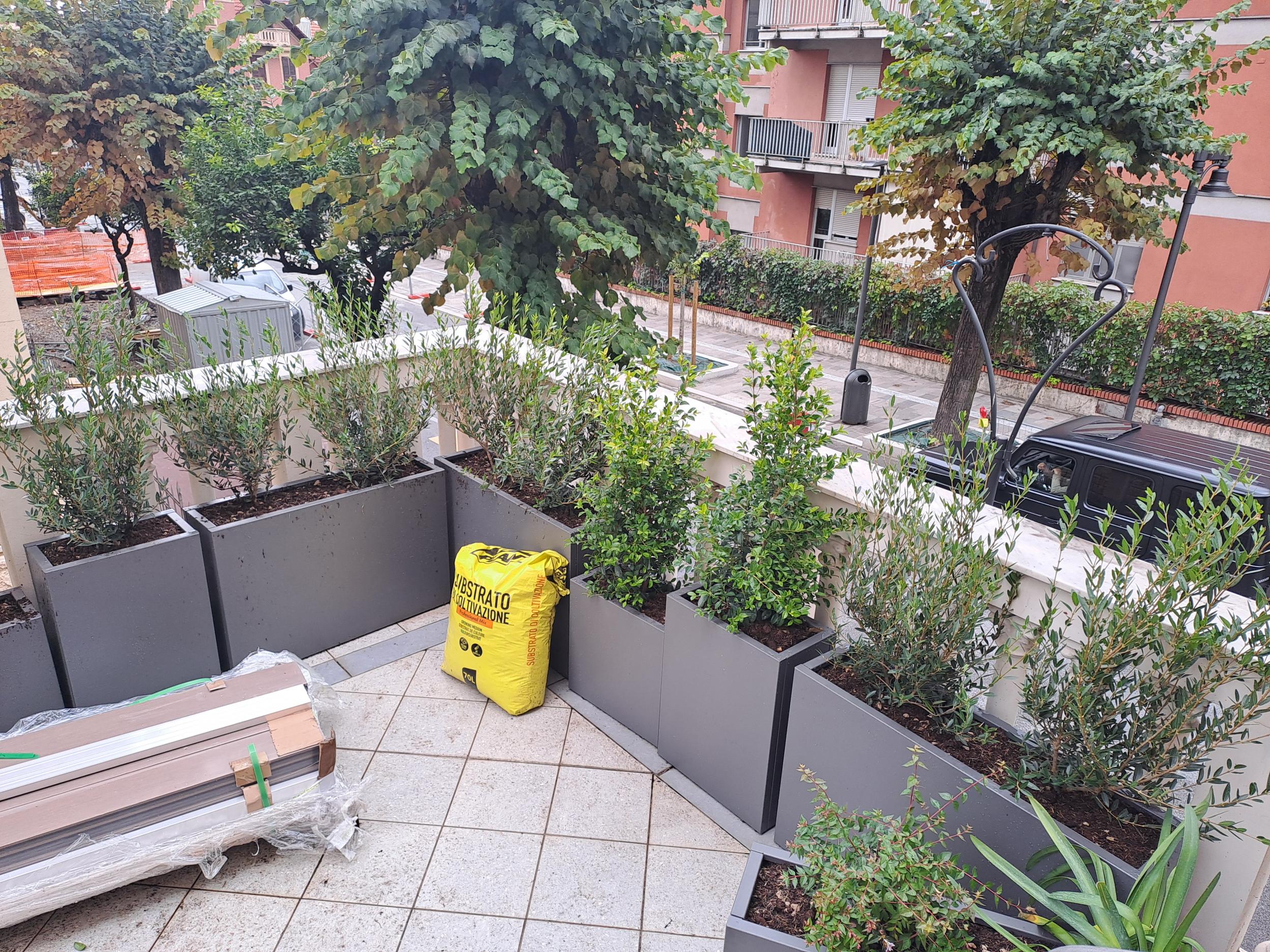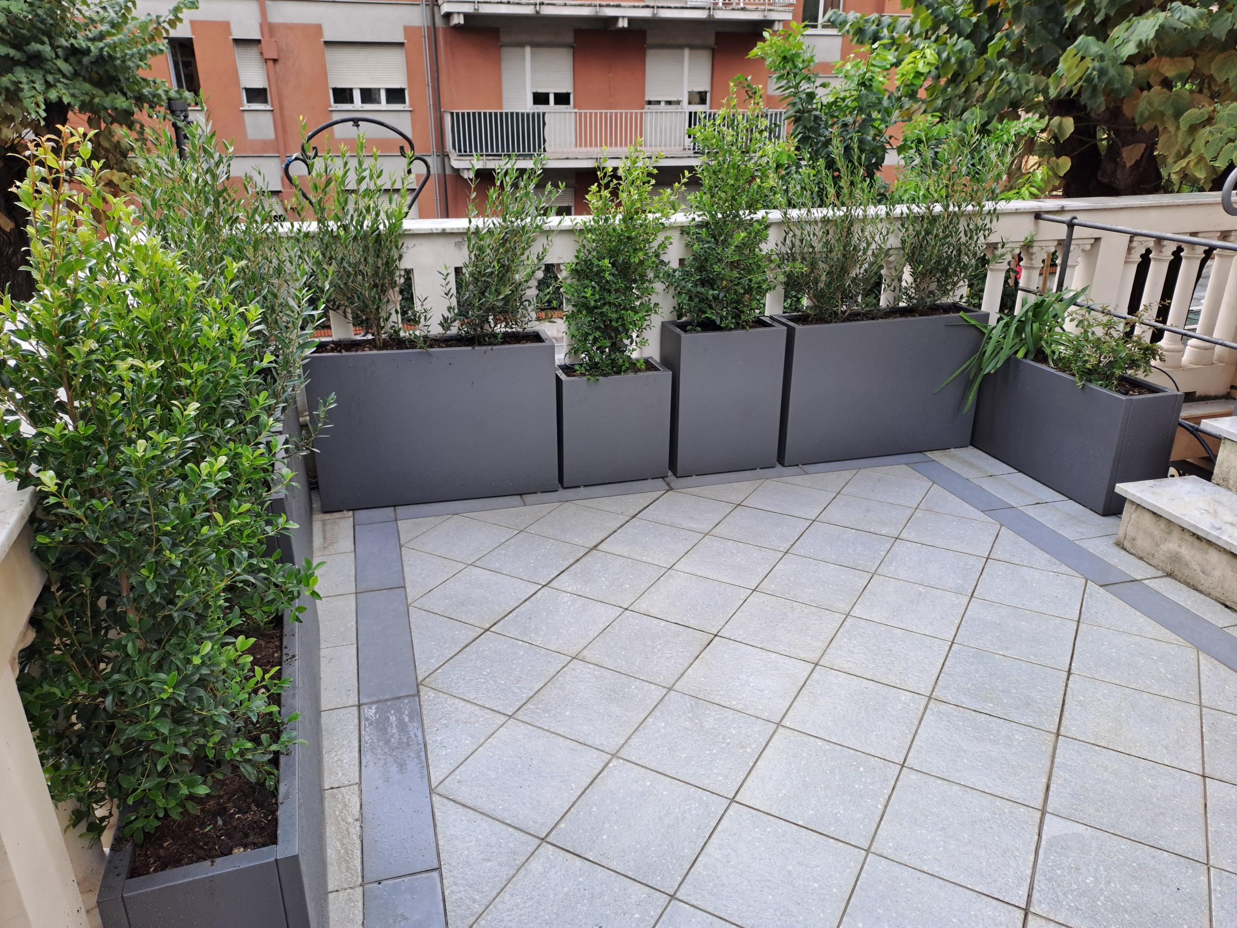 Si è optato per delle fioriere su misura in acciaio, con profondità 25 cm ed altezze diverse, per dare movimento.