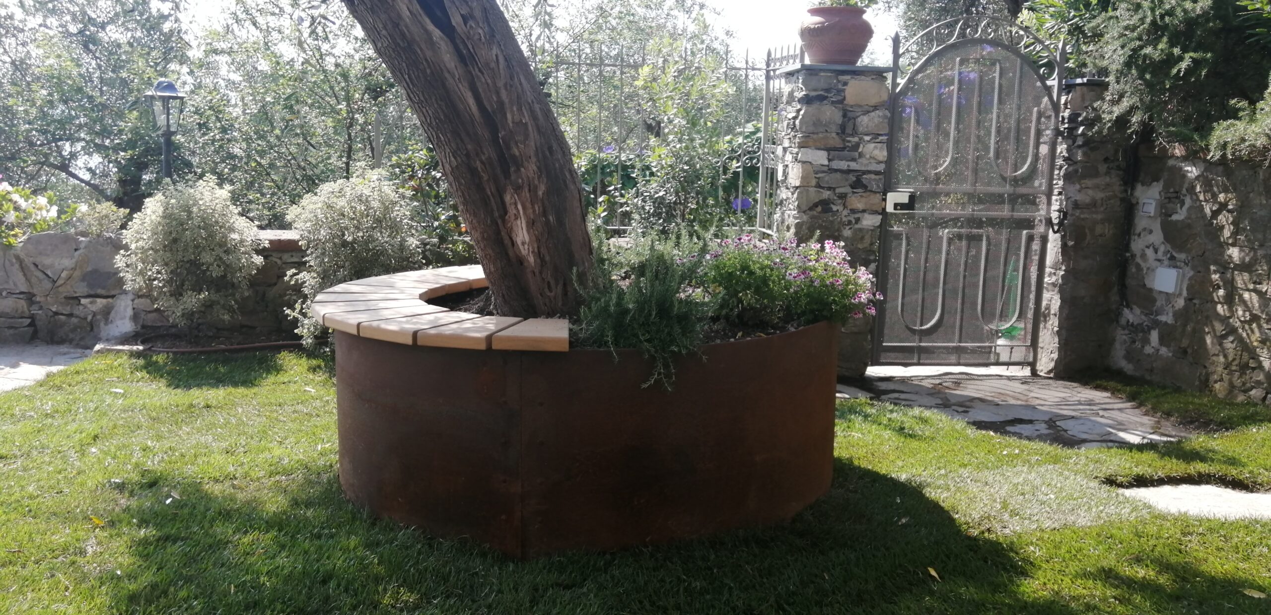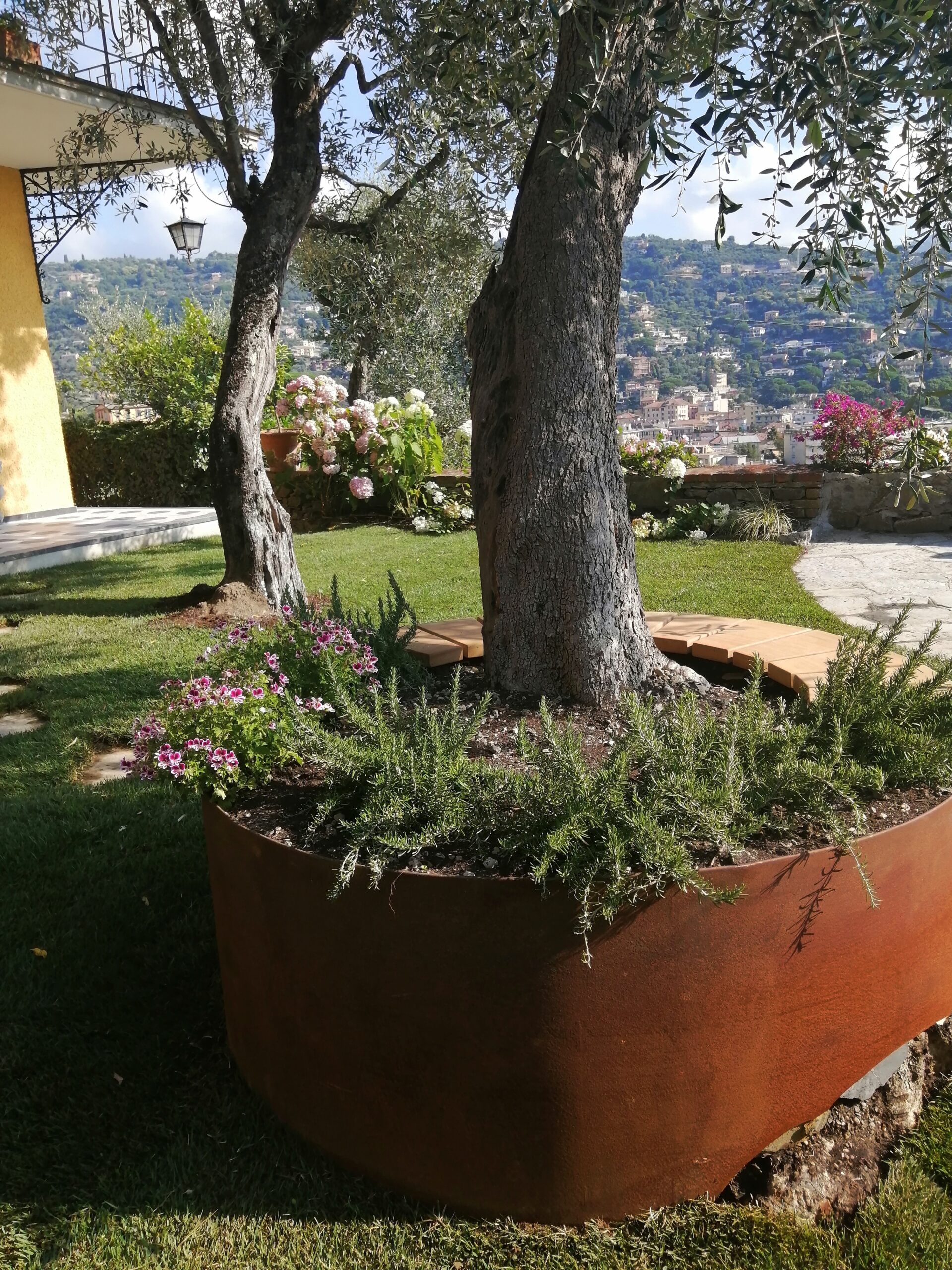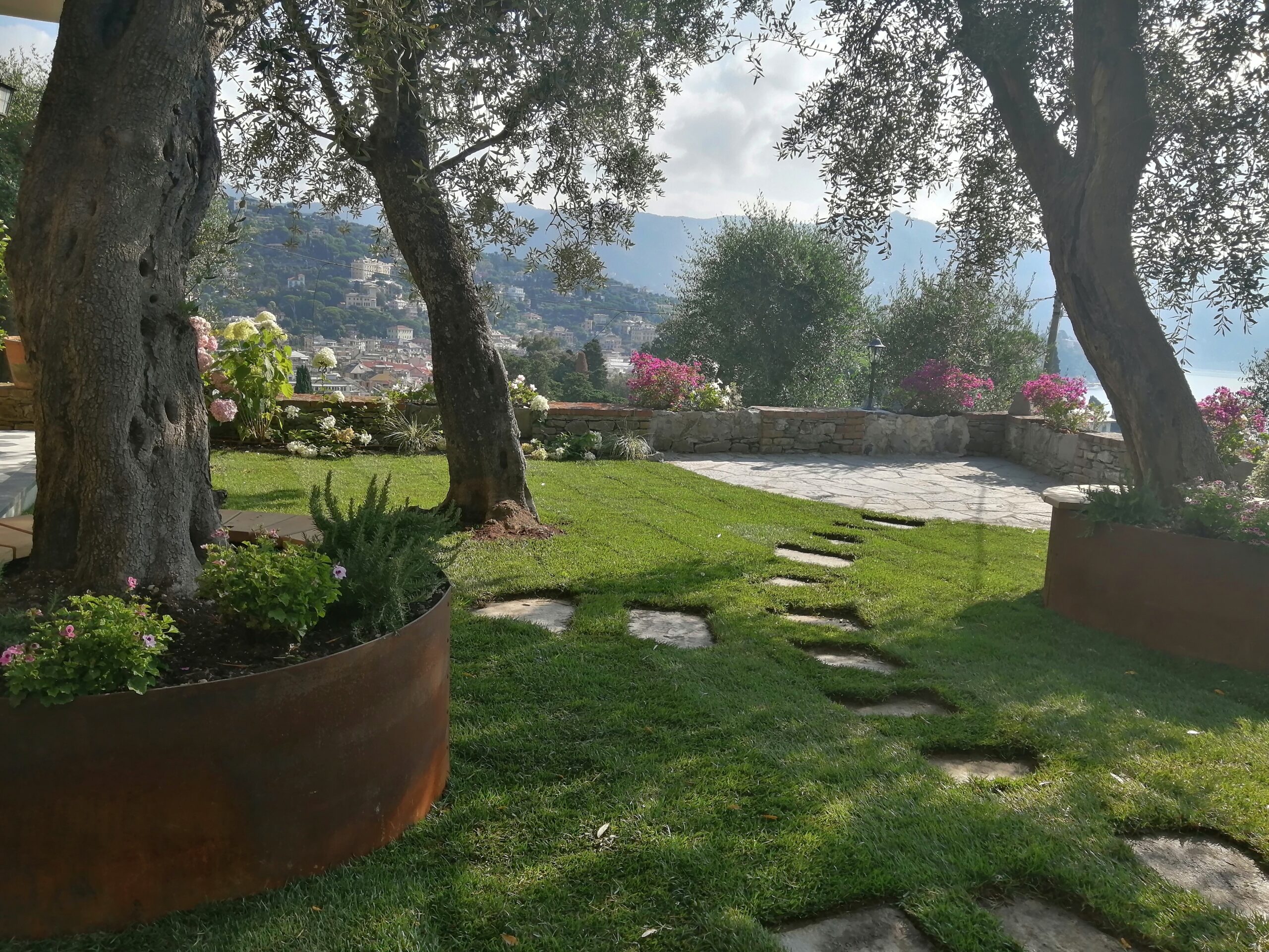 Questo giardino, realizzato alcuni anni fa sulle alture di Santa Margherita Ligure, nasce dalla trasformazione delle vecchie aiuole in pietra in nuove aiuole contemporanee in acciaio Corten, progettate attorno ai due ulivi principali, veri protagonisti.