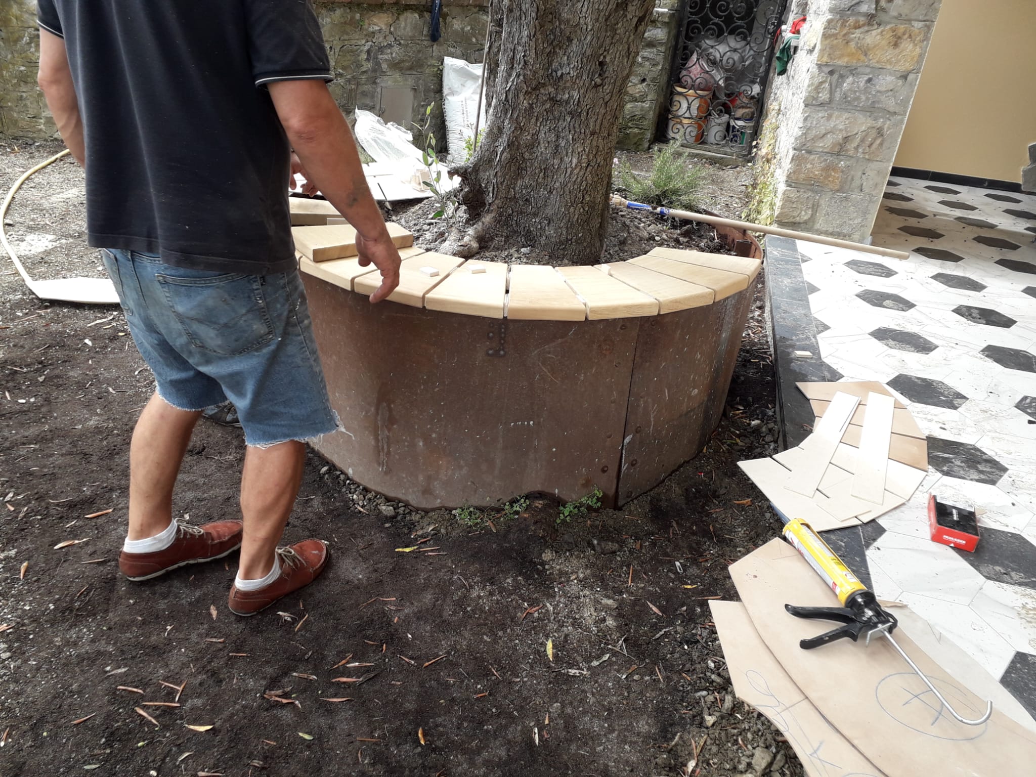Da un terreno originariamente in pendenza è stata ricavata una zona pianeggiante, delimitata da pali in castagno e rifinita con ghiaia di fiume, creando un’accogliente area relax immersa nel verde.